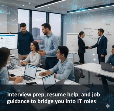 Interview prep, resume help, and job guidance to bridge you into IT roles.